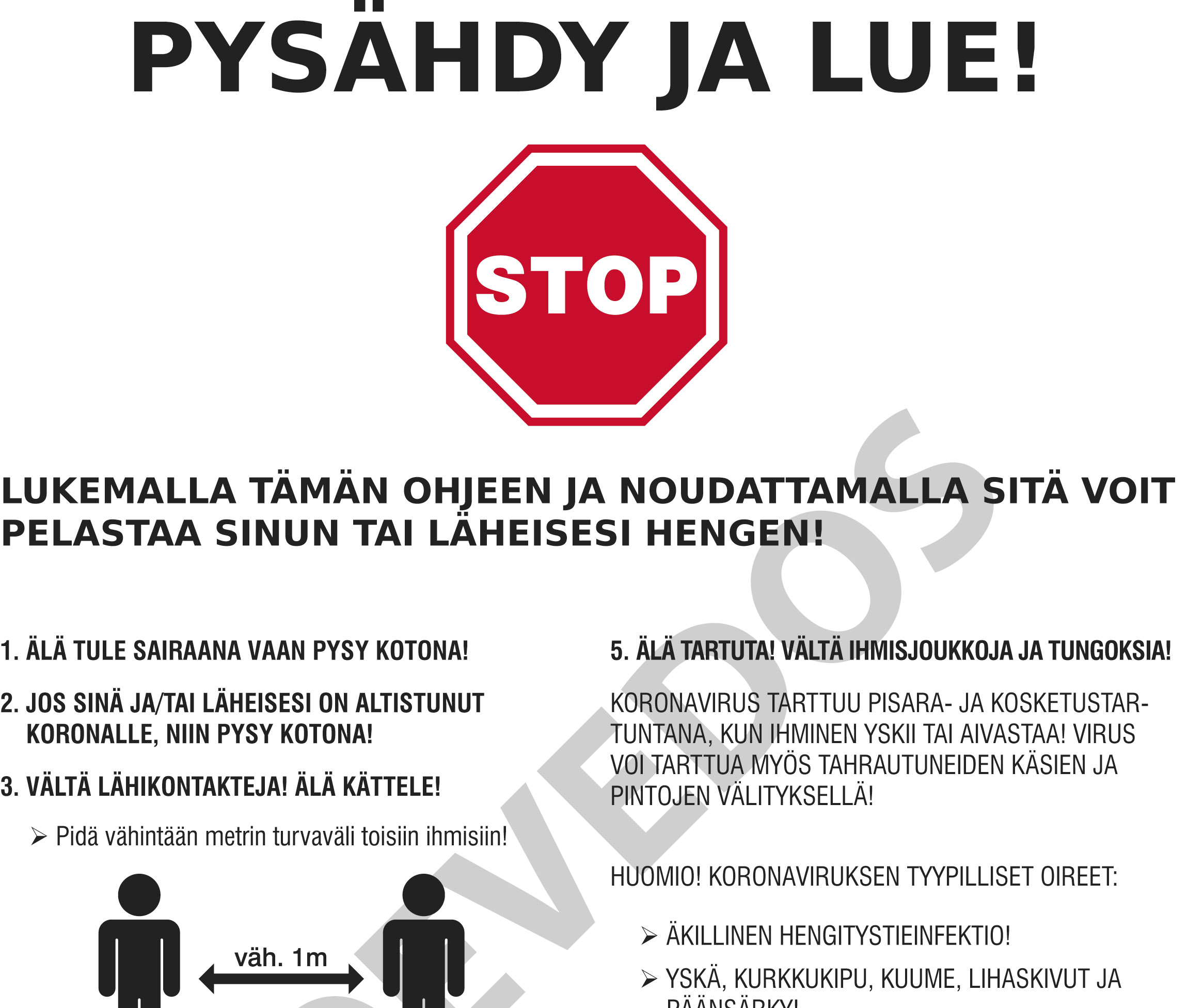 Nämä THL:N hyväksymät, Suomen parhaat ja laadukkaimmat koronan torjuntaohjeet pysäyttävät kiireisimmänkin kulkijan. Ohjeet kannattaa laittaa kiinteistön sisäpuolelle (esimerkiksi sisäänkäynnit, käytävät, infon edusta, kassat, henkilökunnan tilat ja kokoustilat) ja kiinteistön ulkopuolelle (esimerkiksi parkkialue ja ulko-ovien edustat), missä asiakkaat ja henkilökunta liikkuvat. Ohjeiden materiaalina käytetään kosteuden kestävää polypropeenimuovia, joka voidaan hävittää energiajakeena. Tilaajille kaupan päälle tilaajan valitsema määrä (2-10 kpl) Torjutaan koronaa yhdessä!-tarroja.
