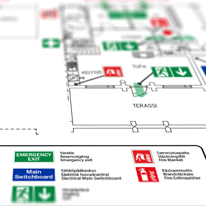 Meiltä myös Suomen parhaat, laadukkaat ja selkeät sekä jälkiheijastavat poistumisreittikartat kiinteistöihin (esim. loma-asunnot ja yritykset). Pyydä tarjous!